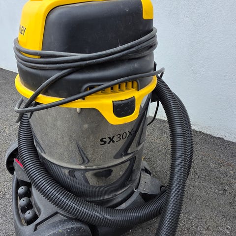 Envirotec industristøvsuger med tilbehør inkludert slange, børster og filtre. Egnet for rengjøring i industrielle eller verkstedområder.