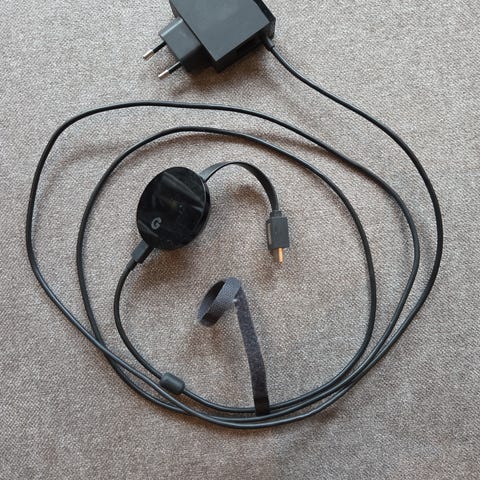 Google Chromecast HDMI-strømming enhet i svart farge. Enheten kobles til TV via HDMI og gjør det mulig å strømme innhold trådløst fra kompatible enheter.