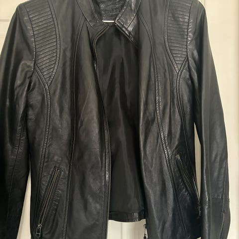 Selger denne kule skinnjakken i ekte skinn. ,Da den er for liten for meg. Er neste ikke brukt. Men har klippet opp innsiden av armene for å få bedre plass.
