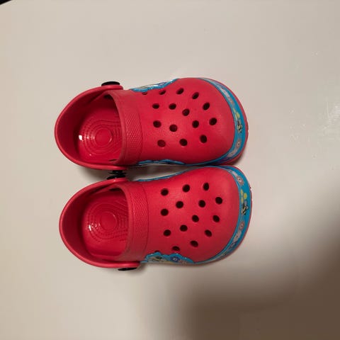 Søte, lysegrønne og rosa crocs i str 25. Kan brukes både som sandaler og innesko.