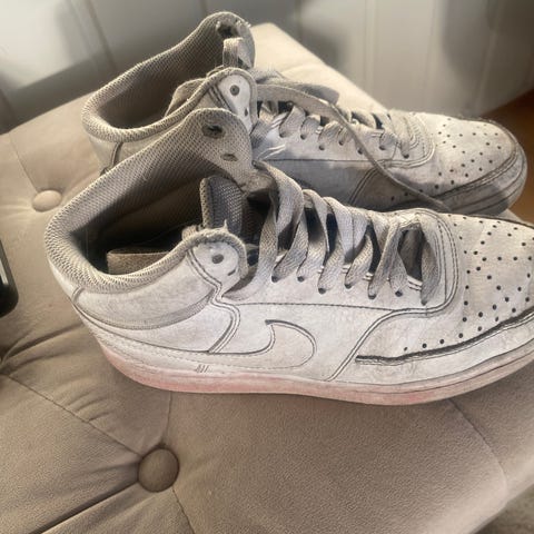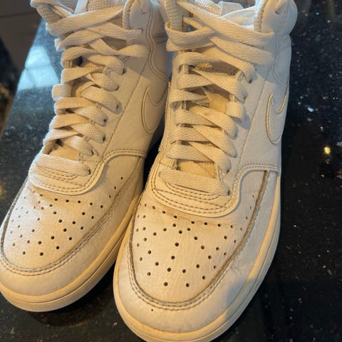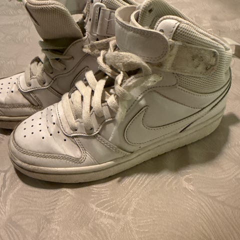 Nike Air sneakers i størrelse 39. Skoene er hvite og laget i skinnmateriale. De har snøring og en gummisåle med Nike-logo. Passer for barn og unge. Nypris på disse er 1500kr.