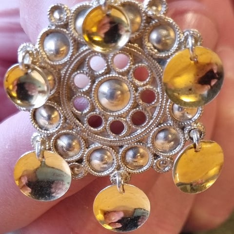Detaljert filigranarbeid med små glass-steiner i ravfarget tone og emaljedetaljer.