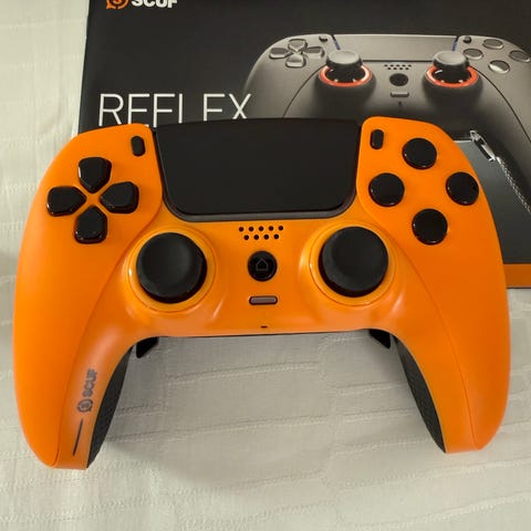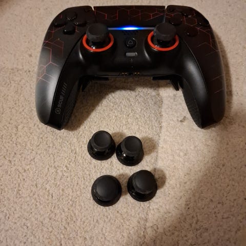 SCUF Gamingkontroll fra 2022 til PS5 selges. Det følger med usb-c lader, ekstra knotter til analogene og to ekstra pads til undersiden. Er noe stick-drift på høyre analog, ellers funker alle knappene.