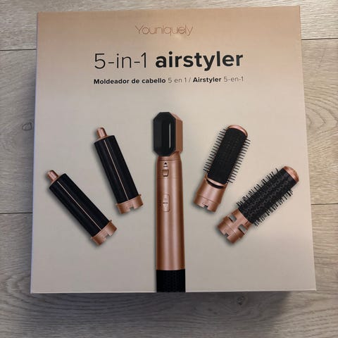 Youniquely 5-in-1 Airstyler hårstyler med fem utskiftbare børster og stylingtilbehør. Produktet er rosa og designet for å style hår ved å kombinere føning og styling i ett verktøy.