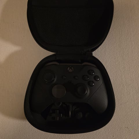 Microsoft Xbox Elite Series 2 trådløs spillkontroller i svart farge. Kontrolleren har justerbare joysticks og utbyttbare deler for tilpasset spillopplevelse. Designet for Xbox-konsoller og kompatibel med PC. Leveres med oppbevaringsetui for ekstra tilbehør.