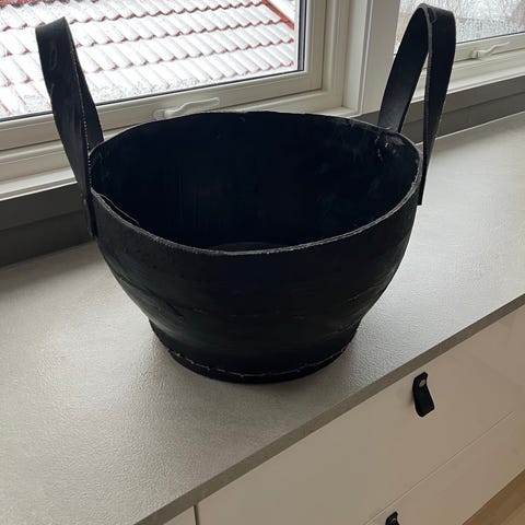 Vedholder i metall med buet form og dekorative detaljer. Designet for oppbevaring av vedkubber ved peis eller ovn. Rustikk og solid konstruksjon med bøyler for stabilitet og enkel håndtering.