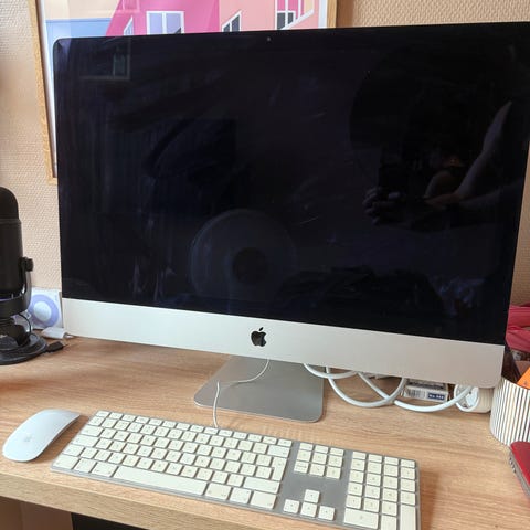 Sølvfarget Apple Keyboard følger med. Det er ikke trådløst (men det er jo egentlig ikke det "trådløse" heller for det må jo plugges til strøm for å lades nå og da), og har ikke touch-ID, men det har numerisk tastatur, noe jeg syns er veldig nyttig.