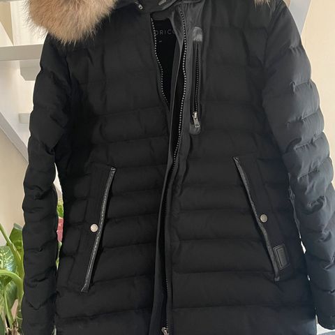 Cedrico Vinterjakke for kvinner i størrelse L. Jakken er svart og har en fyldig, isolerende konstruksjon med en hette og en pelskant rundt hetten. Materialet er designet for å gi varme og beskyttelse mot kalde værforhold. Jakken har ribbestrikkede mansjetter for å holde kulden ute.