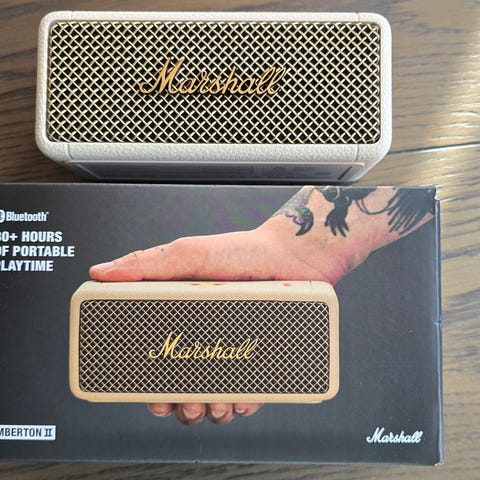 Emberton Il speaker is a collaboration between Marshall and the Dutch streetwear brand Patta, released in February 2024. It is an Emberton II portable speaker featuring a unique and vibrant design inspired by Caribbean sound system culture. The limited run was sold through Marshall and Patta webstores and is no longer widely available.