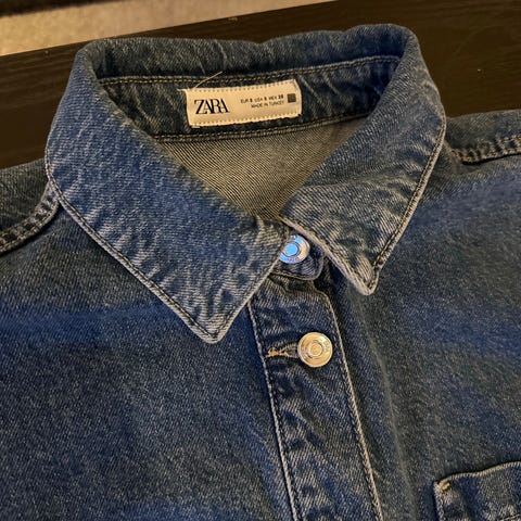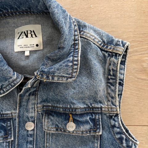 Zara kjolea i denim ,Kjolen har knapper foran og kort erme, med belte i midjen. Jeg er ca 40 størrelse men denne er stor måtte ned i s. er kun brukt 1 gang