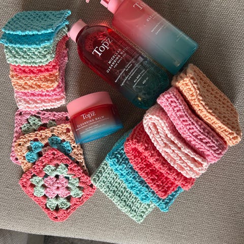 Klutene er strikket i bomull og tåler 60-90 graders vask.