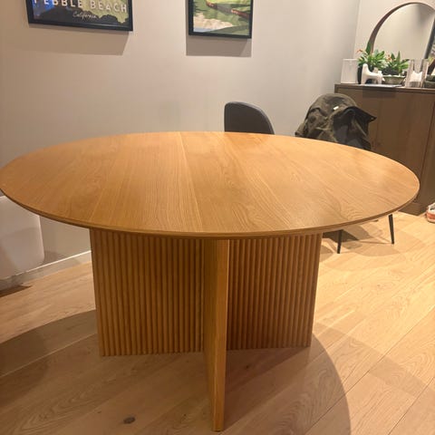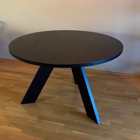 Flott design. Rundt spisebord 80cm i diameter, 72cm høyde. Sort rund fot,stål og tre. Stol 41cm i diameter. Noe bruktslitasje i bordplaten. Må hentes.