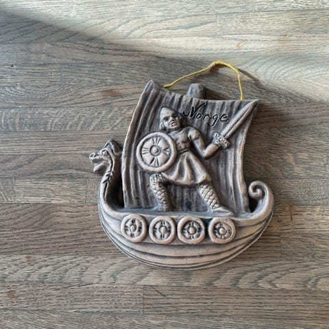 Stor norrøn inspirertvikingskipflis laget av Thyssen Keramik i Danmark. Vikingmotivet er ganske attraktivt og tilsynelatende mer og mer sjeldent i denne større størrelsen. Flisen måler ca. 17,5 x 18,5 x 1,5 cm. Den kan henges på veggen med en innrykket oppheng innebygd i baksiden. Flisen er signert nederst til høyre "L.T."