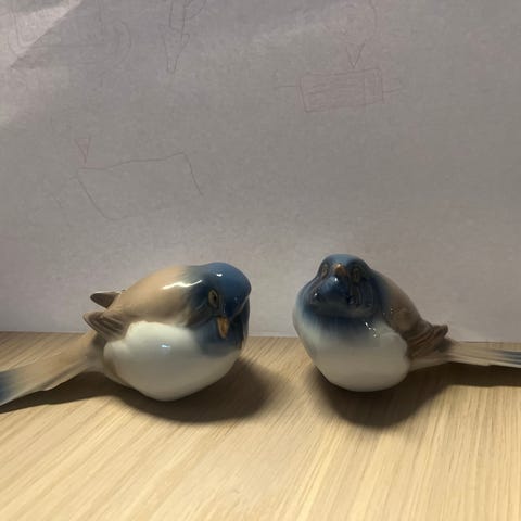 Bing & Grøndahl Idas Blomster porselensfigur, modellnummer 2298. Figuren er håndlaget av høykvalitets porselen og måler omtrent 15 cm i høyden. Den forestiller en jente i blå kjole med hvit forkle, sittende på en krakk og holder blomster. Figuren ble produsert mellom 1959 og 1960.