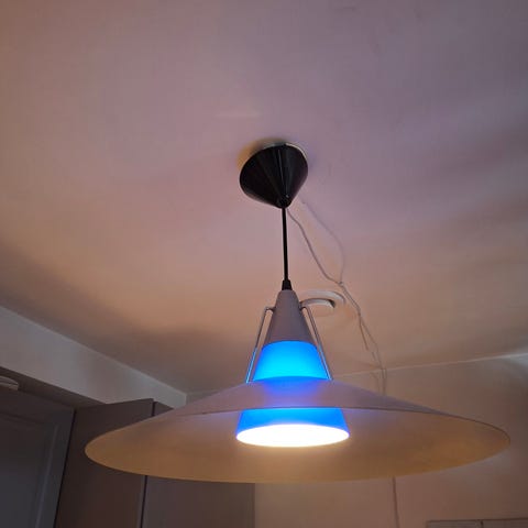 taklampe i gul metall materiale. Lampen har en konisk form med riller og er designet for takmontering. Passer til bruk i ulike rom som gir et dekorativt og funksjonelt lys.