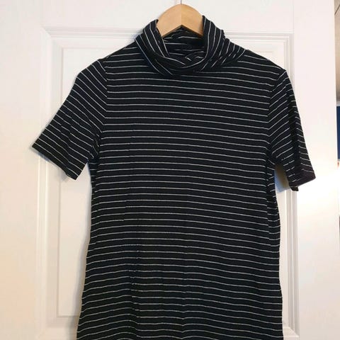 Høyhalset topp i svarte stretch stripende blandet stoff. Lengde ca 53 cm, bredde mellom ermene ca 40 cm, ermene lengde can 50 cm