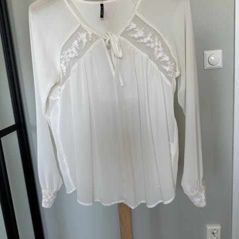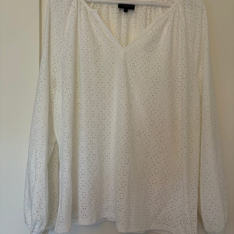 Pen Riccovero bluse i størrelse 42 for kvinner. Blusen er hvit og har detaljer i et nettmønster ved skuldre og foran. Materialet er lett og behagelig i viskose. Pent brukt og i god stand.
