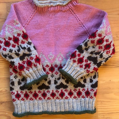Hjemmestrikket ullgenser med julemotiv str 4-6 år selges da brukeren har vokst ut av den.