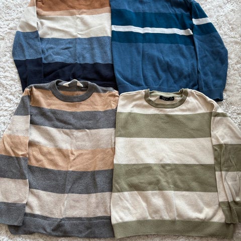 Pakke med pent brukte gensere, brukt av gutt her. Flest fra HM, som er str. 110/116. Ellers fra merker som Next, Marvel, Batman, Mini Rodini (den gule. Denne er 116/122, men litt liten i størrelse).