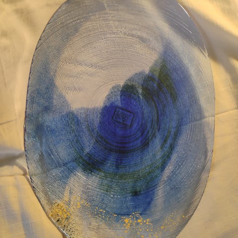 Hadeland Glassverk, Jupiter, glassfat, kobolt blå, gull, dekorfat, kunstglass, norsk design, 40cm, Maud Gjeruldsen Bugge, skandinavisk interiør