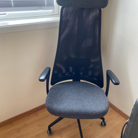 Grå FLINTAN kontorstol fra IKEA. Hjul og justerbar høyde. Mesh-trekk på rygg, samt armlene.
