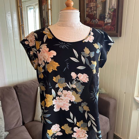 T-skjorten er blå med blomsterprint og laget av 100 % lin.