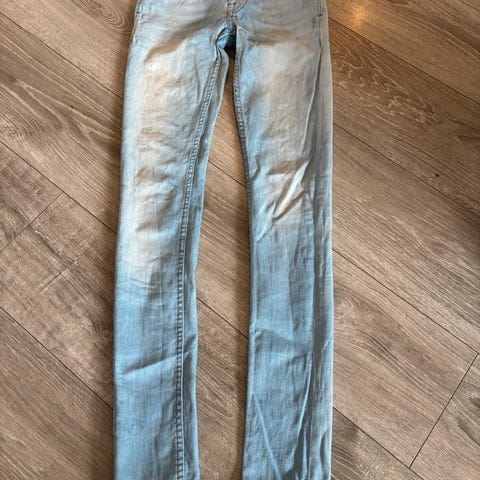 Diesel Skinzee Low jeans i blå farge, størrelse midjevidde W24. Jeansene har en slank passform og er laget i stretchmateriale. Denne er kjøpt med et veldig slitt utseende, men er også slitt litt mer ved bruk. Limt noen lapper under de største