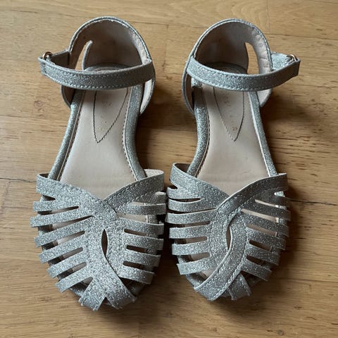 American Eagle Jente Sandaler i sølvfarge, størrelse 33 1/2. Sandalene har en åpen tådesign med stropp rundt ankelen og gummisåle for bedre grep. Helt ny og aldri brukt.