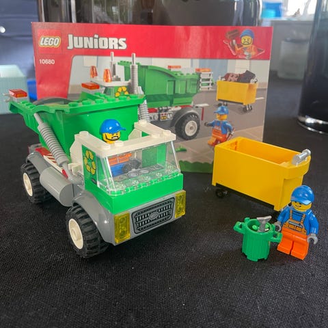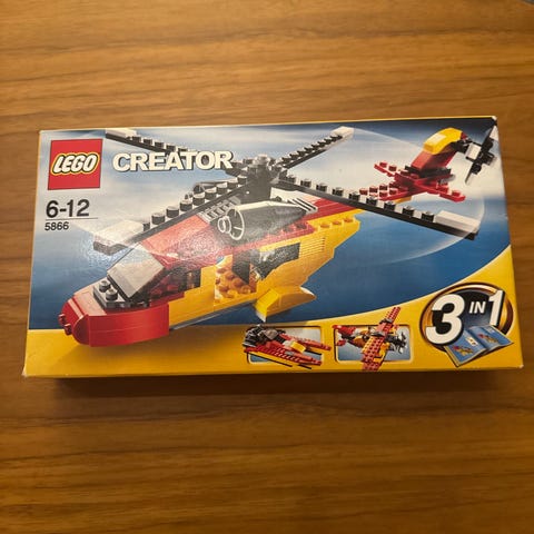 LEGO City Helikopter og lastebil lekesett med flere minifigurer. Settet inkluderer et gult helikopter og en rød lastebil med kran, samt tilbehør som våpen og verktøy. Passer for barn fra 5 år og oppover. Byggesett i plastmateriale med detaljerte figurer og kjøretøy.
