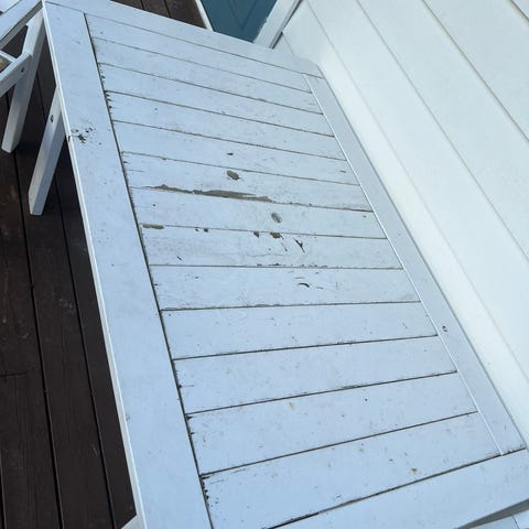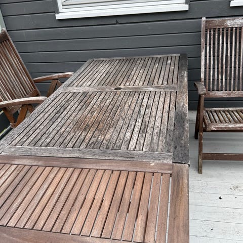 Bordet har synlige værslitasjer og sprekker i treverket (se bildet). Har vært behandlet i treverket, men ikke helt vellykket (lakken flasser). Jeg har likevel brukt det inntil nylig med vinylduk over.