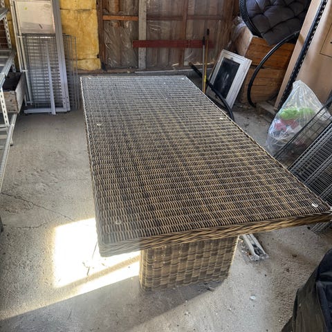 Hagebord laget av tre og plast rotting. Lett, stort og funksjonelt, passer fint til 6 personer.