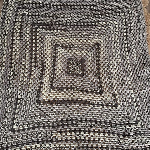 Nylig heklet koseteppe, blandings garn, mykt å godt. 115x115 cm. Noen bilder er lyse men det er mrkebrun og mellombrun i fargene. Det er lyset som gjør at det ser lysere ut.