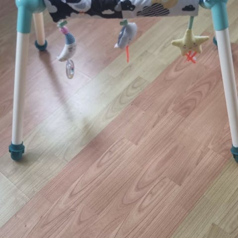 Hvit babygym i sau, pent å lite brukt, ingen flekker kjøpt på Jollyroom for ca 1 år siden, er med leker som henger i de over. Er også en måneformet pute som hører med