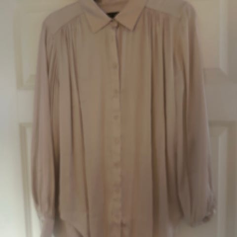 Brukt 1 gang, Adele Altman blå bluse. Italiensk design i str IT46, som tilsvarer L. Klassisk og feminint snitt, enkel og tidløs fasong. Liten splitt i siden og lenger bak.