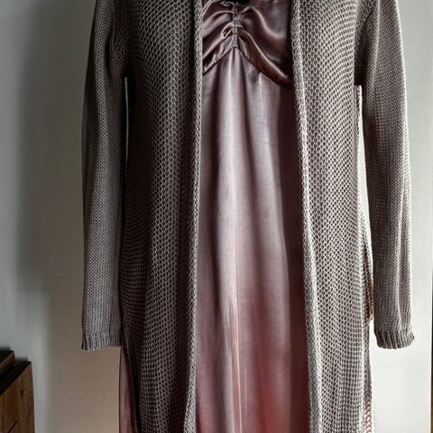 Riccovero Cardigan i størrelse M, farge grå. Strikket materiale med luftig og lett tekstur, egnet for lag-på-lag bruk. Designet har åpen front og lang lende med splitt i hver side. Modellen heter Gladeview Jacket. 100% Raime, Nypris kr 1199,-. Har en lik i fargen beige som er brukt, se egen annonse.