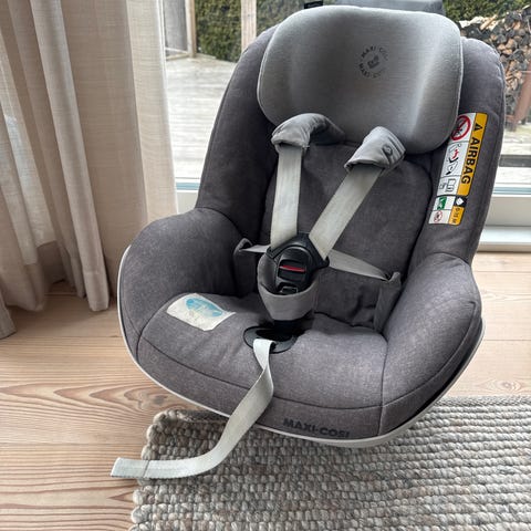 Setet og basen ble kjøpt nytt i slutten av 2019, og tatt i bruk fra ca midten av 2020. Har ikke vært i noen kollisjon, og det er ingen skader på selve setet eller isoporen inni. Trekket kan tas av og vaskes.