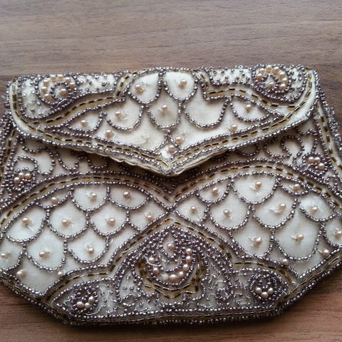 Vintage selskapsveske made in England. Med en fin brodert pynt på forsiden. Stoffet har løsnet litt nær låsens bakside.