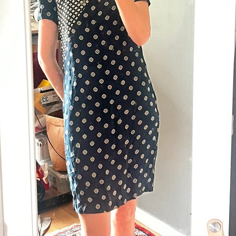 Mønstret kjole fra Bitte Kai Rand i sort og gul. Glidelås på siden. Lett stretch og glans i stoffet.
