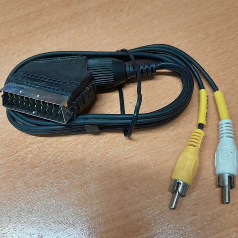 Scartkabel 1 meter lengde med overgang til 4 phonoplugger . Lyd inn - ut og video inn - ut .