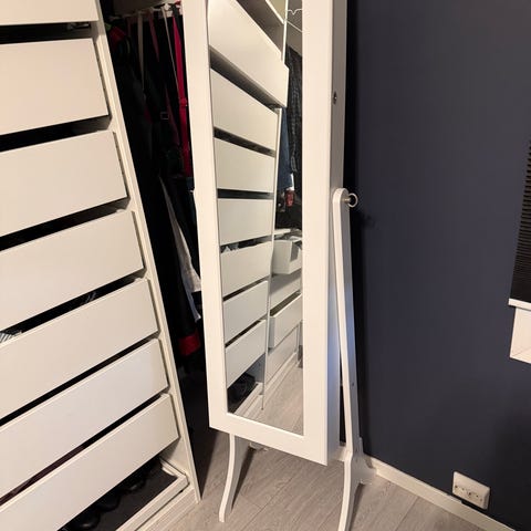 Hel speil med hvit ramme, rektangulært design. Egnet for bruk i soverom eller gang for å gi full oversikt av refleksjon. 170cm høyt 40 cm bredt.