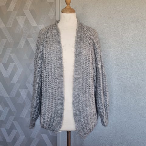 Fra Pepper Corn. Foret, 50% mohair og 50% akryl. Lengde 95 cm. Litt innsvinget. Mangler en knapp.