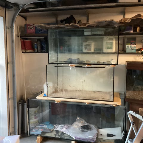 To glassakvarier med lokk, inkludert dekorasjoner som steiner, planter og ornamenter. Egnet for oppdrett av små til mellomstore akvariefisk. Passer til hjemmebruk eller som del av et akvariumoppsett.