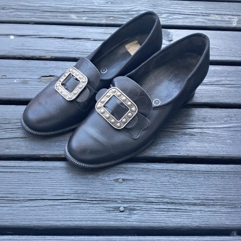 Selger Klaveness, Tone 2, bunadsko i str 6 (tilsvarer 39+). I god stand, men noen merker i front av sko etter spennen på skoen (se bilde). Bred lest for god passform. Nypris ca 1600.