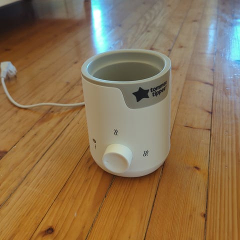Chicco flaskevarmer i hvit plast med enkel temperaturkontroll. Designet for oppvarming av babyflasker. Kompakt størrelse og brukervennlig funksjon.