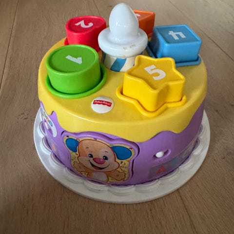Fisher-Price Dumbell leke med lys og lyd, designet for barn. Leken har en sekskantet form med fargerike sider og inkluderer interaktive elementer som lyder og lys.