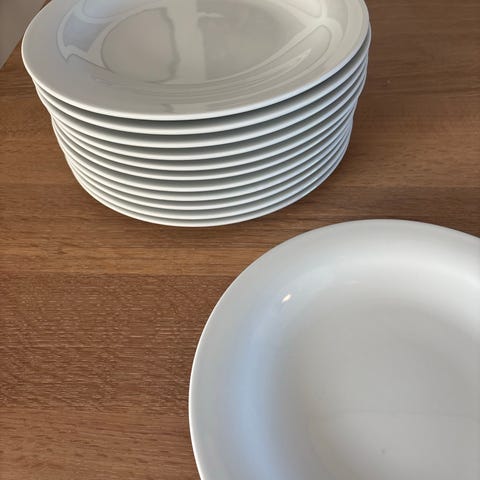 IKEA sett med keramiske tallerkener, middag og frokost (5 av hver), samt suppeskåler (4stk) Tallerkenene er hvite og laget for allsidig bruk. Et like hakk i en skål.