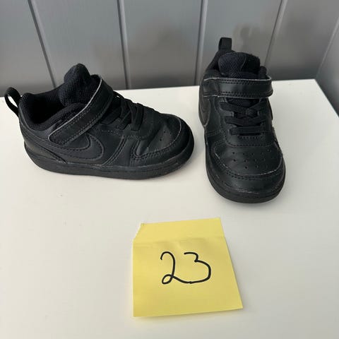 Nike unisex barnesko i størrelse 23. Skoene er svarte med hvit logo og såle. De har borrelås for enkel justering og påkledning. Materialet er pustende og egnet for barn.