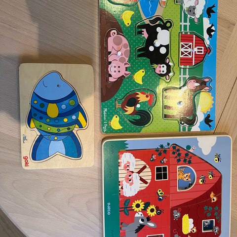 Melissa and Doug Farm Friends Trepuslespill. Puslespillbrikkene er tykke og solide, laget av tre. 6 trepuslespill med 2 deler og tema om gårdsdyr; hund, ku, gris, sau, kylling og hest.