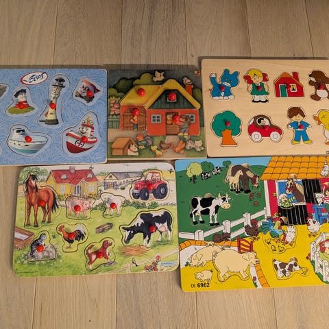 Melissa and Doug Farm Friends Trepuslespill. Puslespillbrikkene er tykke og solide, laget av tre. 6 trepuslespill med 2 deler og tema om gårdsdyr; hund, ku, gris, sau, kylling og hest.