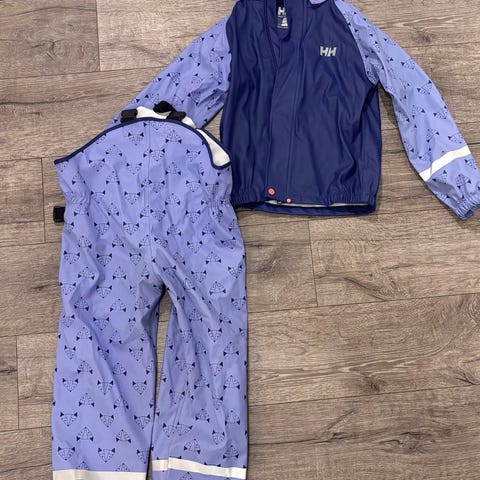 Brukt regntøy til gutt selges samlet for 150kr. Kjøpt ny og brukt av et barn. Noe slitasje på utsiden av buksen og noen flekker på innsiden av buksen (se på bilder). Vasker ferdig. Kommer fra et røykfritt og dyrefritt hjem.